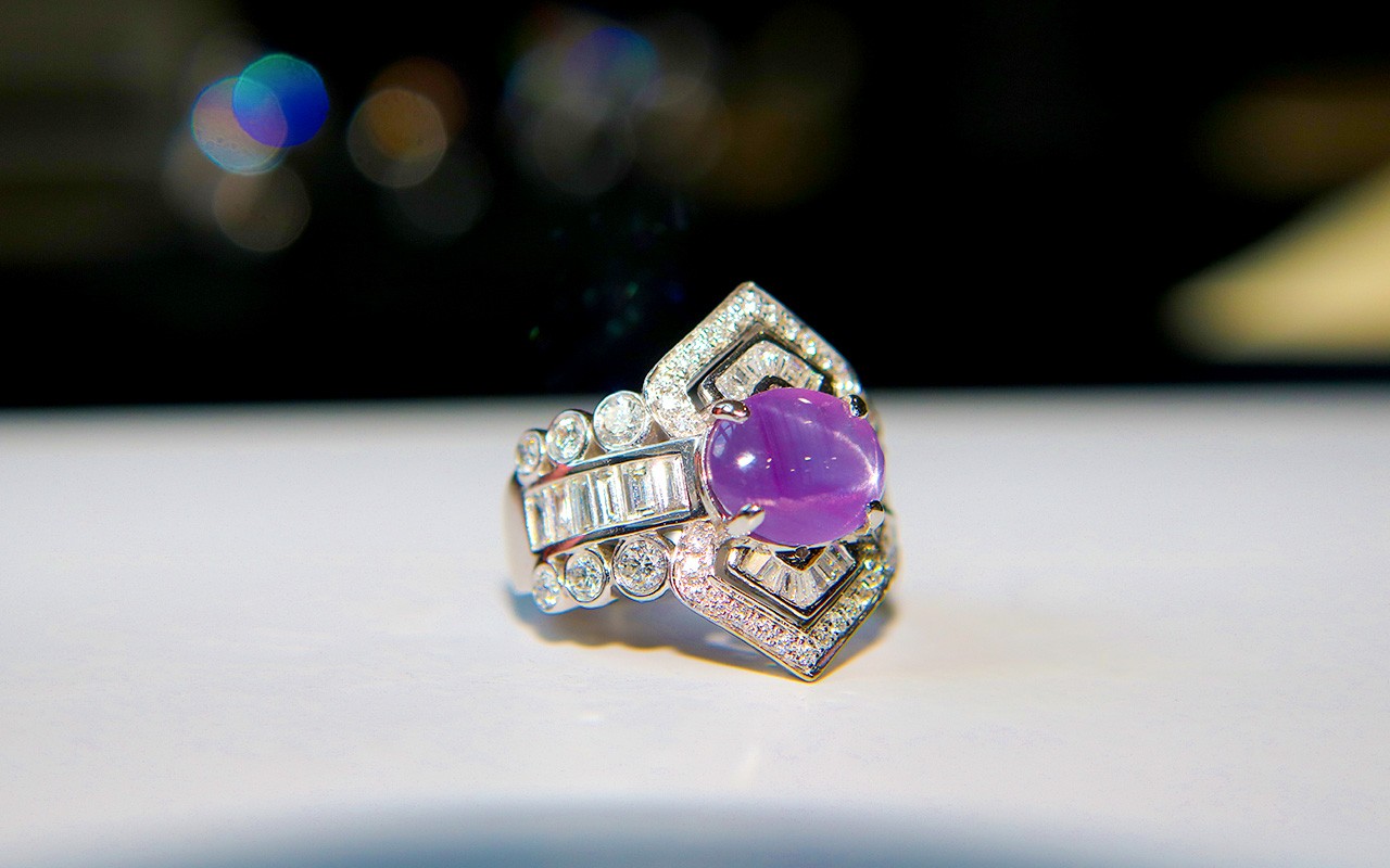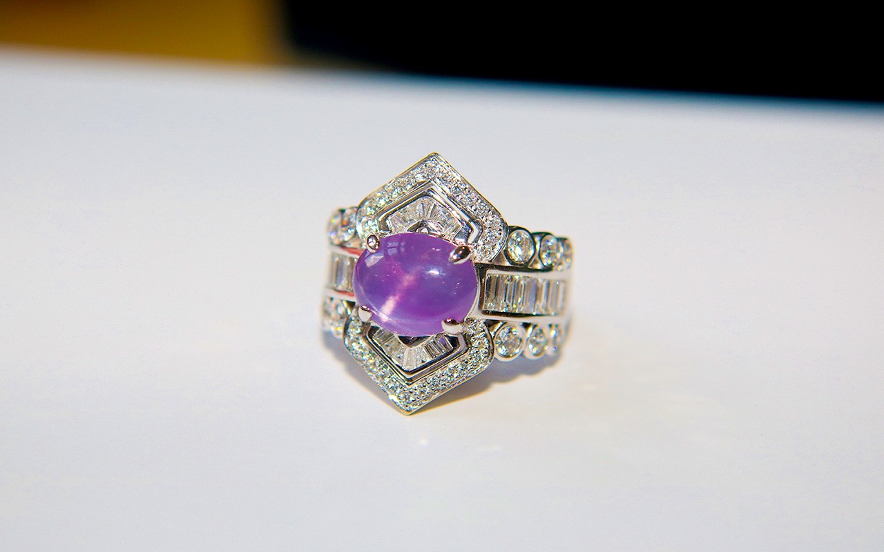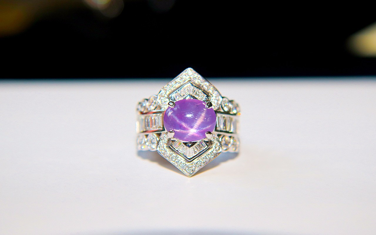 为其命名为'紫蓝之星'。日光下呈靛蓝色,没有瑕疵、全透明、星光完美、灵活、清晰明亮。更为惊奇的这是一颗'变色星光蓝宝石',该宝石在白色光源下呈蓝色,在黄色光源下呈紫色,在紫外灯光下呈红色。