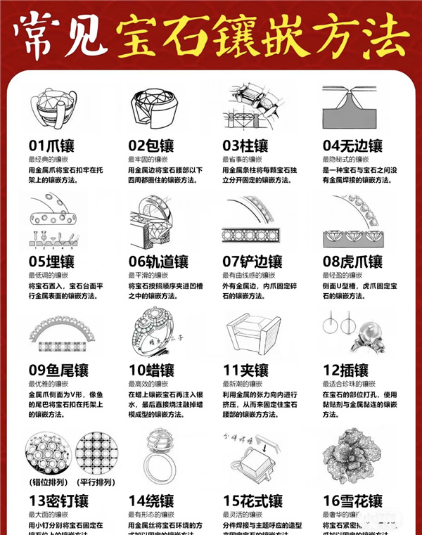 镶嵌是珠宝首饰制作中的一项重要工艺,精美的镶嵌工艺能更好地展现出每一件珠宝的璀璨与美丽。上千年来一代代的工匠们创造了许许多多的镶嵌方法。